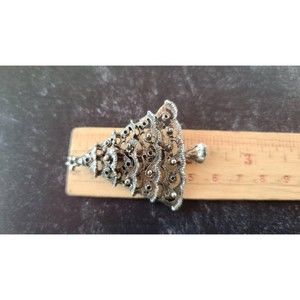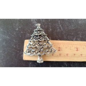 This is a vintage silver tone metal filigree Christmas tree shaped brooch.