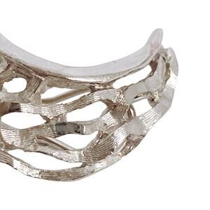 A sculptural pair of silver tone clip-on earrings with flowing openwork curves captures the bold abstract aesthetic of mid-century modern design. Their dimensional crescent form offers a sophisticated statement that reflects the experimental styles of the 1960s–1970s.