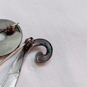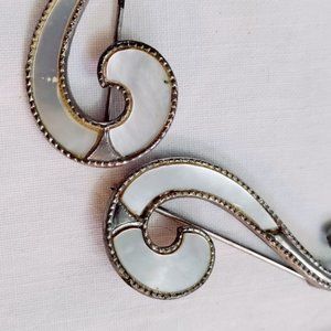 Antique Silver Tone and Mother Of Pearl Insert Swirl Brooch Pin Set Of 2 with c clasp. In good condition for the age. The metal in the back shows some wear and verdigris.