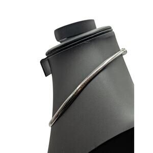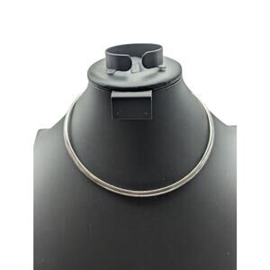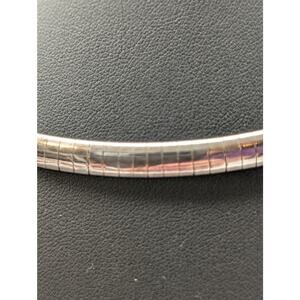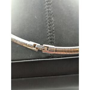 Vintage Silver Tone Omega Fold Over Clasp Necklace. Approximately 16" round and 1/4" wide. Pre-owned, this omega necklace is in good vintage condition.