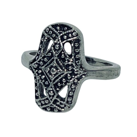 This vintage silver tone ring features an intricate open work design, reminiscent of the opulence of the Art Deco era. Its unique craftsmanship and elegant style make it a distinguished accessory for those who appreciate historical fashion elements. This piece exudes timeless charm and elegance, perfect for collectors of vintage jewelry.