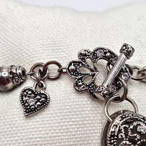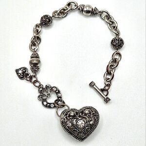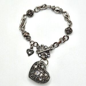 Vintage filigree detail charm bracelet. Silver-tone hardware. Puffy heart with rhinestone details charm. Heart toggle clasp close. Measures about 7.5" long. Purchased from an estate and no visible maker's mark. Some minor patina on back of heart that could be cleaned if desired. Excellent condition besides and smoke-free home.