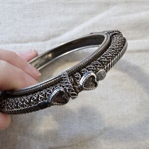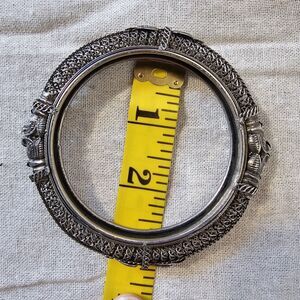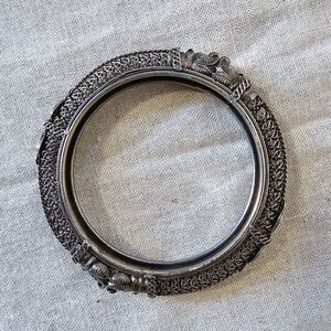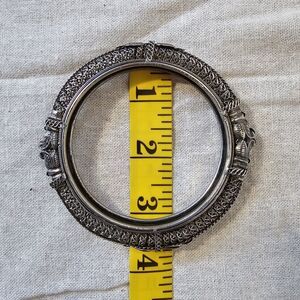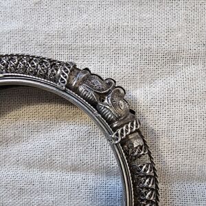 The bangle is round in shape and comes in a silver color, making it an ideal fit for any fashion style. The base metal is unknown, but its quality speaks for itself. The bracelet is a perfect fit for those looking to add a vintage piece to their jewelry collection. This beautiful piece does not feature any stones but its craftsmanship and design make it an excellent choice for any fashion-conscious person.