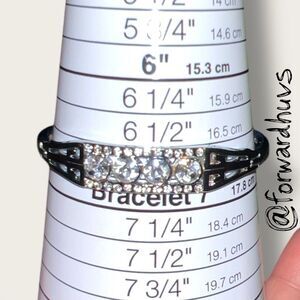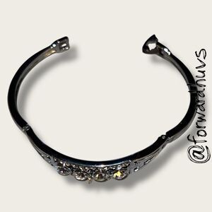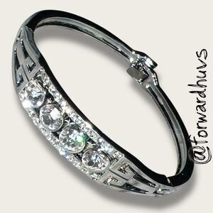 This elegant rhinestone bracelet features a silver tone metal setting with a symmetrical design that centers around four round rhinestones, flanked on each side by a line of smaller rhinestone embellishments. The layout creates a balanced, eye-catching sparkle that’s ideal for formal wear or adding a touch of vintage charm to everyday outfits.