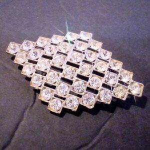 This exquisite Vintage Silver Tone Rhinestone Brooch features a timeless bar style design, meticulously crafted with a silver-tone finish. The centerpiece is a stunning diamond-shaped arrangement, intricately set with rows of sparkling clear rhinestones, creating an elegant and eye-catching piece. Measuring 2 3/8 inches in length by 1 5/8 inches in width, this brooch is the perfect blend of classic beauty and sophistication. In beautiful condition, it’s a striking accessory that adds a touch of vintage glamour to any outfit or collection.