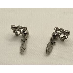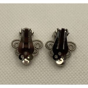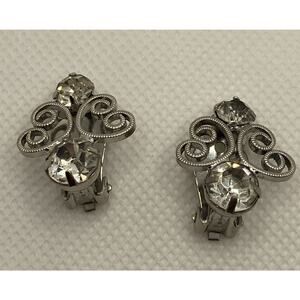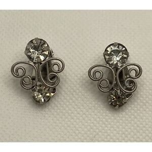 Vintage Silver Tone & Rhinestone Textured Open Heart Clip On Earrings Costume