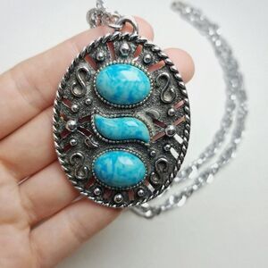 Vintage Silver Tone and Blue Pendant Necklace, Long Chain, Statement, Retro 70s