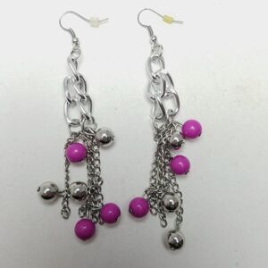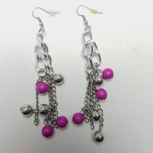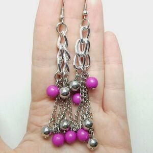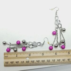Vintage Silver Tone and Pink Beaded Chain Fringe Dangle Earrings, Fun Estate