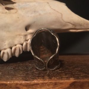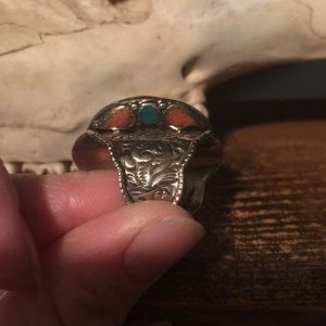 Large turquoise and silver ring. Great detailing on silver & behind stone. Band is slightly adjustable, it can be pinched or stretched a little to fit multiple sizes. As shown the size is about 7. It would fit a 6.5-8, possibly larger ring size. Great statement and looks badass on! Amazing piece needs a loving home!