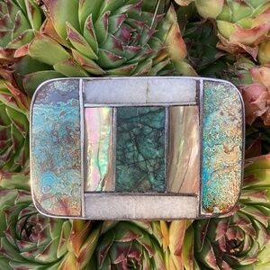 This is an outstanding and very beautifully done belt buckle. Features a turquoise, quartz stones and a Mother of Pearl inlay in a silver setting. This is a very unique and eye catching piece. Quality made and in good overall vintage condition. (See photo's for overall condition). No maker marks. I believe it is handcrafted. This vintage and handcrafted beauty is sure to add a touch of class to any outfit!