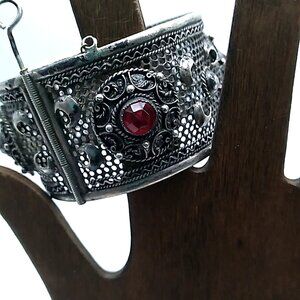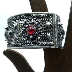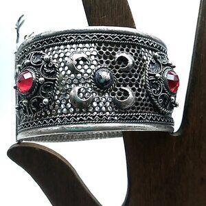 Vintage Silver Wide Filigree Hinged Bangle Bracelet with Red Glass Stones