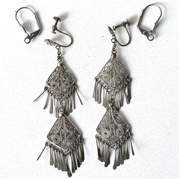 Delicate fringed handmade 1940's twisted filigree wire earrings with fringes.
