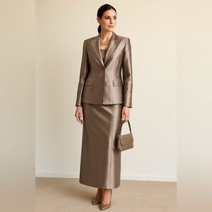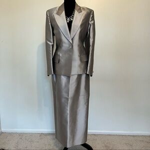 This beautiful vintage Silver elegant formal 2-piece long skirt suit attire, is perfect for a formal event or wedding.Structured jacket. Size 6. Suit is an excellent condition.