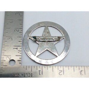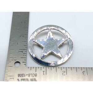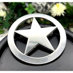 A polished silver-tone brooch featuring a bold star design encased in a circular frame. Ideal as a statement accessory or collectible piece.