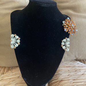 Vintage Silver tone clip ons earrings with amber and an amber AB crystal Brooch