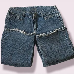 Time to say goodbye to these well-loved, stretch blue jeans. Medium blue wash. Frayed bottom hems but no other flaws or holes, very good used condition. STRETCHY.