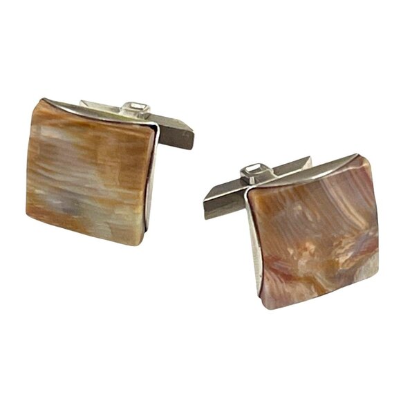 These cufflinks evoke an air of timeless sophistication with their rectangular design, featuring a rich brown swirled pattern atop a silver-tone base. Perfectly designed to add an elegant accent to formal attire, these accessories combine classic craftsmanship with a touch of vintage charm that tells a story of enduring style.