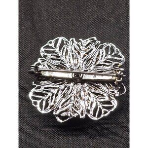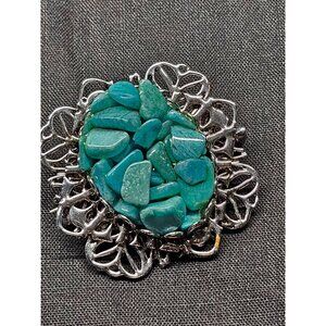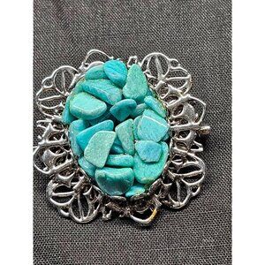Oval brooch with vibrant turquoise stone chips and intricate silver-tone filigree. Adds elegance to outfits or accessories.