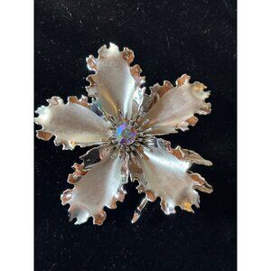 Vintage Silver-Tone Flower Brooch With Aurora Borealis Center Stone