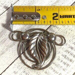This vintage brooch features a unique leaf motif encircled by intricate loops, exuding an antique charm. Its silver-tone finish adds a touch of timeless elegance, suitable for both formal and casual settings. The pin back ensures secure attachment to fabric, making it a stylish accessory to enhance any outfit.