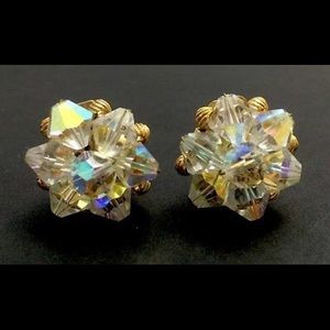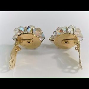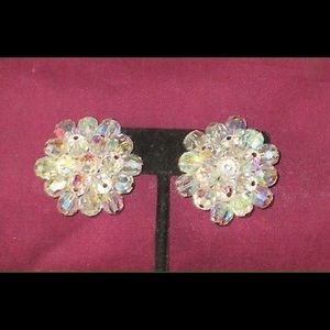 Vintage Silver-Tone Metal Large Aurora Borealis Crystal Bead Clip Earrings.