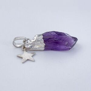 Title: Vintage Silver-Tone Star Charm Amethyst Raw Crystal Pendant