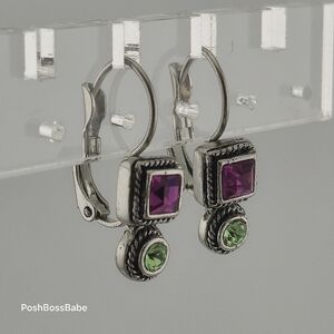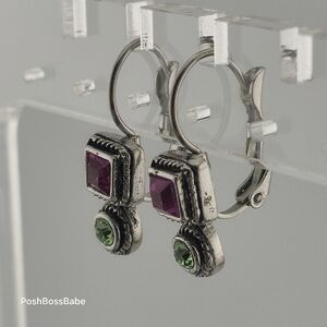 These vintage-inspired silver-toned drop earrings feature vibrant square-cut purple stones and round green stones. With a secure lever-back closure, these earrings offer both beauty and comfort for everyday wear or special occasions.