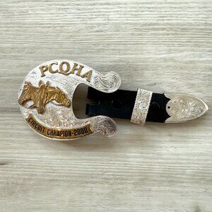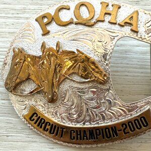 This is an original Vintage PCQHA (Pacific Coast Quarter Horse Association) Circuit Champion 2000 trophy belt buckle, crafted by Silverado in a silver overlay design.