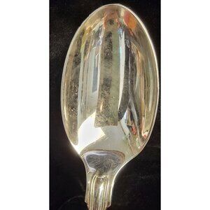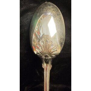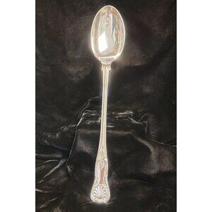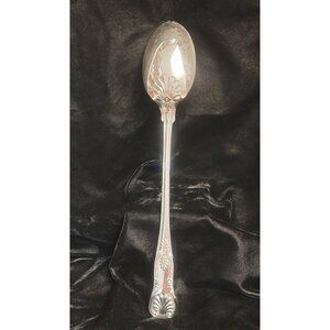 This is a vintage mid-1900s spoon, specifically a large, silver-plated serving spoon in the "Kings" pattern. The handle is elaborately decorated with a rococo-inspired pattern. This includes a prominent shell-like motif at the very end of the handle, followed by intricate scrollwork and leaf-like designs extending up the handle. It features a deep, oval-shaped bowl, characteristic of a serving spoon. The handle is long and slender, complementing the decorative elements. Please see the provided photos for further details.