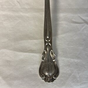Elegant vintage silverplate serving spoon with ornate detailing on the handle and scalloped bowl. This long 10.5-inch piece is beautifully crafted and perfect for formal dining, special occasions, or adding to a silverplate flatware collection.