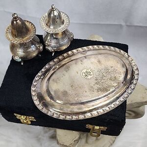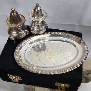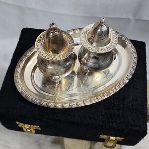 Vintage Silverplate Salt & Pepper with Tray and Crushed Velvet Case