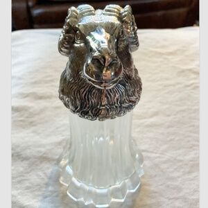 A striking Corbell Silver Company figural decanter, dispenser, or lidded vessel featuring a finely detailed ram's head lid, crafted in tarnish resistant silver plate, set atop a fluted glass body. This piece is suitable for syrup, cream, or sugar. The ram's head is rendered with lifelike texture, coiled horns, and expressive facial features, while the base features vertical fluting and a starburst-style bottom cut. This piece blends naturalistic sculpture with elegant craftsmanship, making it a distinctive decorative object or collectible dining item.
