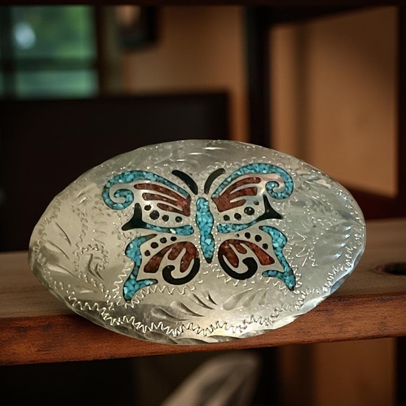 Vintage Silver,red & blue turquoise inlay Butterfly Buckle,marked CB hippie