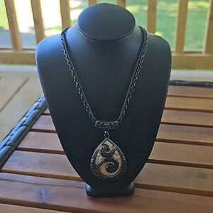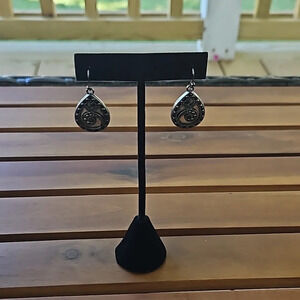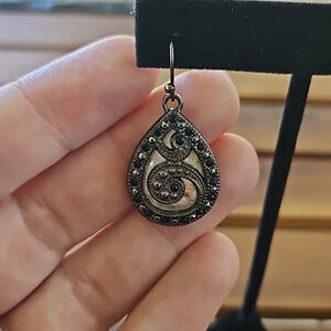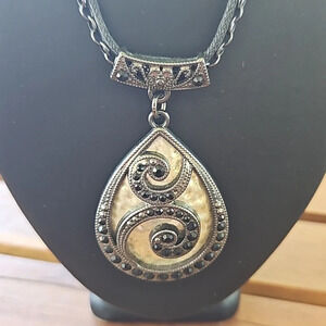 Vintage Silvertone Black Gem Pendant Necklace & Earrings Set
