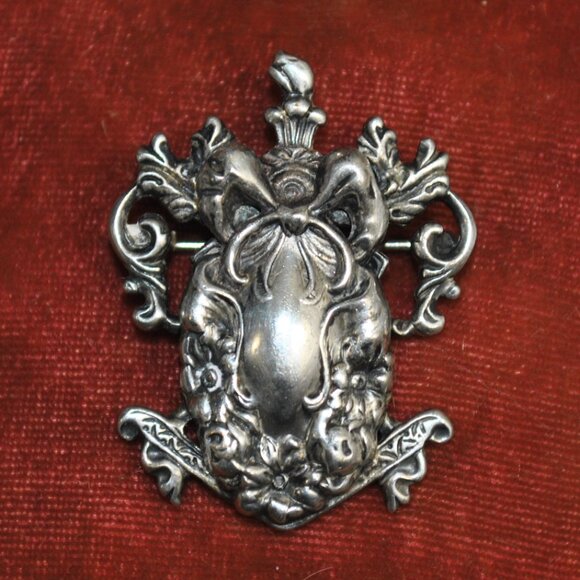 This is a lovely vintage silver-tone brooch with filigree / heraldic design. The has been polished some, and it did not test as silver. Overall, the brooch is in pretty good shape.