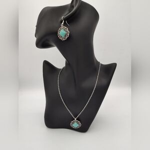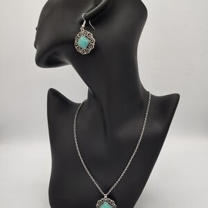This exquisite jewelry set features a stunning turquoise stone set in elegant silver. Perfect for adding a touch of sophistication to any outfit.