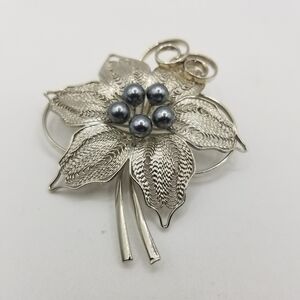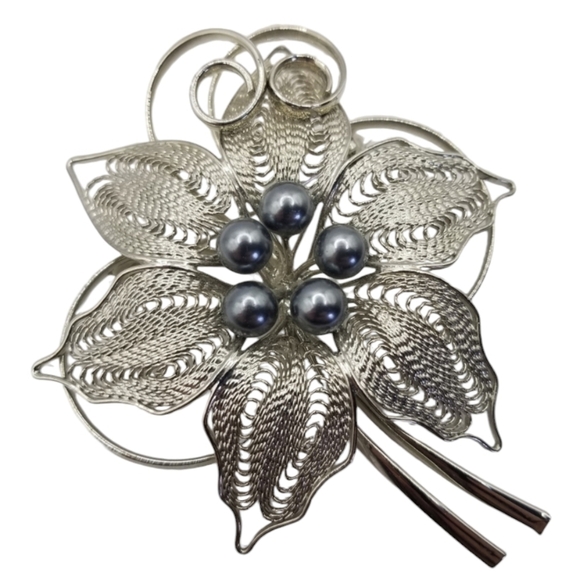 Vintage Silvertone Wirework Flower Brooch Pin Faux Pearls Gray Large Estate