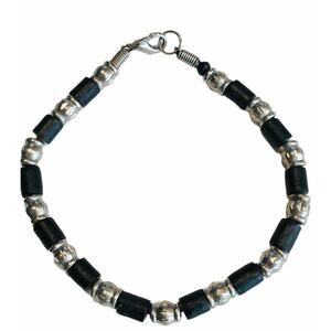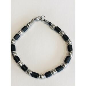 Vintage Silvertone and Black Wooden Beaded 9" Bracelet Lobster Claw Closure