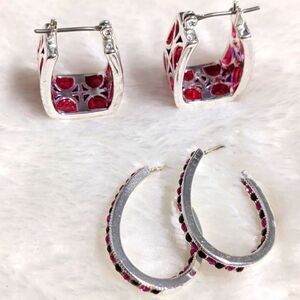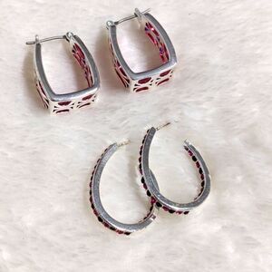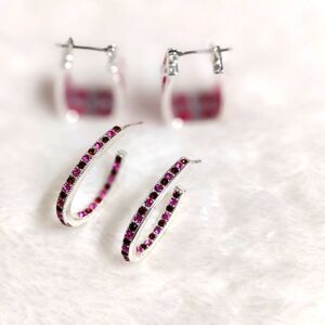 one pair is a square shaped hoop with pink acrylic and rhodium plating.