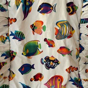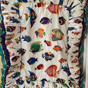 So beautiful!! The colors are sharp and it’s in excellent shape! The lined ruffle has yellow and white polka dot trim! The tropical fish are beautiful! Would be cute to take baby pictures on also! The underside is a rainbow type print. Early 90’s.