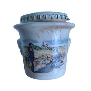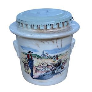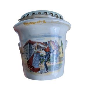 Material and Design: Constructed from durable stoneware, the crock features a rich cream-colored glaze. Many models are adorned with hand-painted Alsatian scenes by artist Henri Loux, depicting rustic village life. The sides often include molded lion's head handles, adding to its classic appeal.