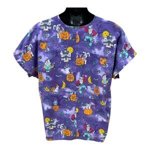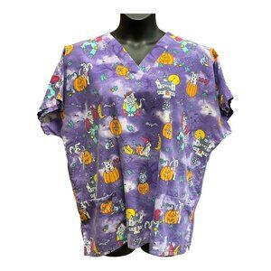 Vintage Simply Basic Size 2XL Purple Halloween Scrub Top Cats Haunted House Moon