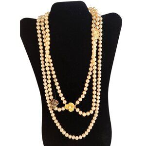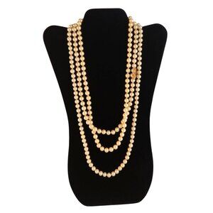This exquisite vintage faux pearl necklace features three lustrous strands with a creamy champagne hue, accented by a stunning gold-tone floral clasp with rhinestone detailing. Measuring approximately 26 inches when open in length, it lays gracefully around the neck, making it an elegant addition to formal or vintage-inspired attire. The necklace is marked "H&S Originals" with its original tag intact, testifying to its vintage authenticity and quality craftsmanship. Each bead showcases a refined polish that elevates its luxurious appearance.