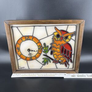 Vintage Simulated Faux Stained Glass Owl Clock Wood Frame Signed TAMOR Retro MCM