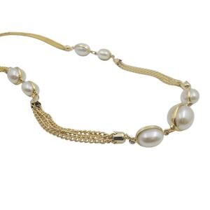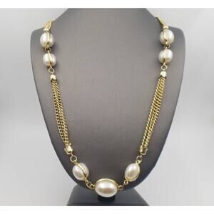 This beautiful necklace features 3 simulated double-sided pearl cabochon stations and 4 sections comprised of 3 chains with endcaps.