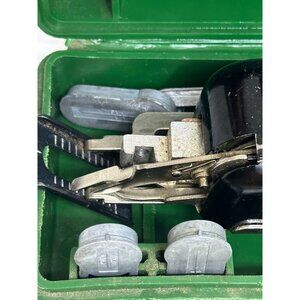 Complete your sewing setup with this vintage Singer buttonholer attachment. Includes the original green case, templates, and Greist plate. Designed for precise buttonholes, this retro sewing accessory is a must-have for collectors and sewing enthusiasts.