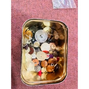 Vintage singer sewing tin container, with old buttons inside a penny was left there too . It’s black with multicolor letters and flowers . Please view all pictures . Ready to ship . Thank you