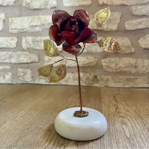 Vintage Single Rose Stem Painted Brass Copper Brutalist Metal Art Marble Base