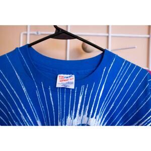 Vintage blue Hanes t-shirt featuring a bold white sunburst wave graphic across the front. Made in the USA, single-stitch cotton tee with that perfect soft, lived-in feel. Tag reads Hanes Heavyweight 50/50. Measures approximately standard adult size (see photos for tag). In great vintage condition with normal wear — vibrant color and striking design make this one a standout piece.