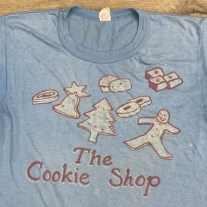 Unique kitschy vintage handmade “The Cookie Shop” Christmas cookie soft single stitch Tshirt. A unique 80’s casual holiday shirt. Some minor signs of age as pictured, overall great Vintage Condition.